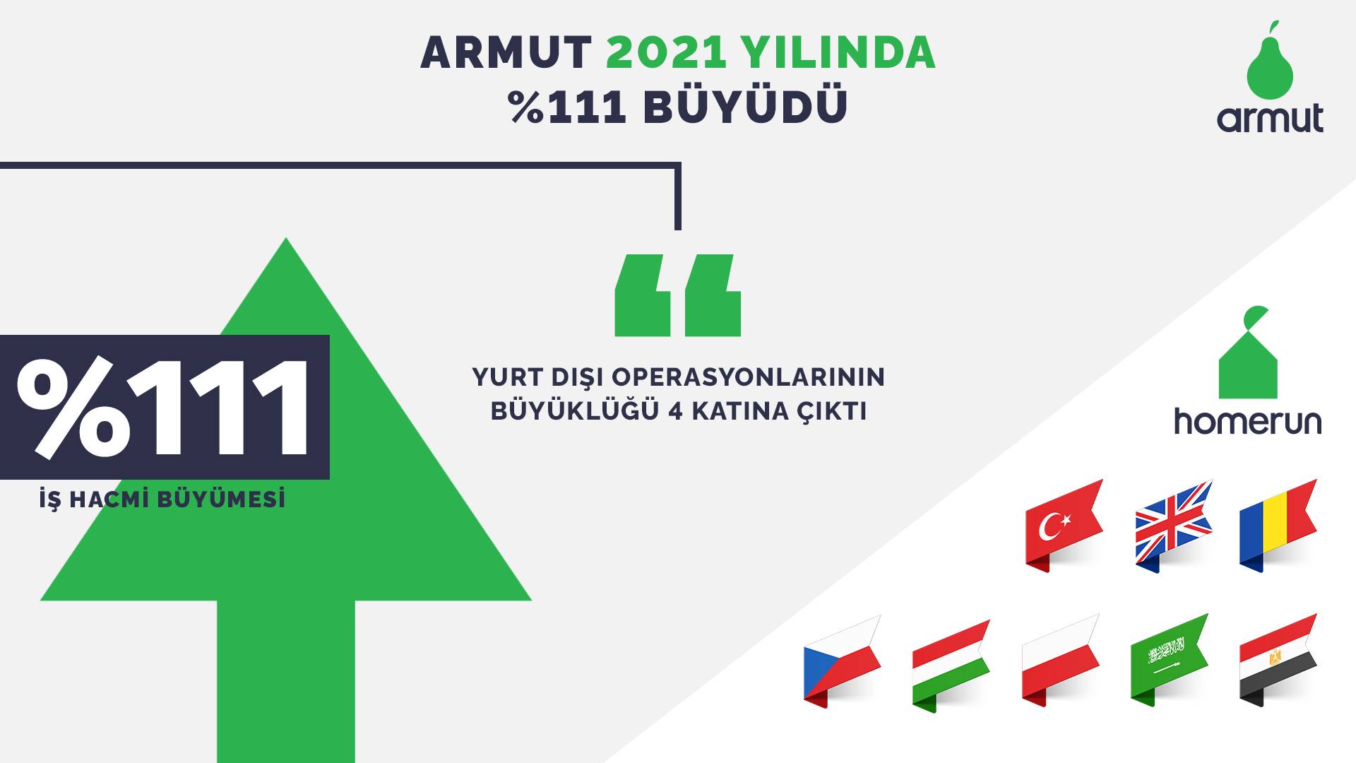 Armut Kurucu Ortağı Erol Değim, pandemiye rağmen yurt dışı yatırımlarına hız kesmeden devam ettiklerini, Avrupa liderliğini hedefleyen global markaları HomeRun ile İngiltere, Mısır, Romanya, Suudi Arabistan, Polonya, Çekya ve Macaristan’da yer aldıklarını belirtirken, bu ülkelerdeki faaliyetlerini hızlandırdıklarını aktardı: “Özellikle Polonya, Çekya ve Macaristan’a baktığımızda 2021 taleplerimiz bir önceki yılın 5 katına ulaştı. İngiltere’deki talep büyümesi ise yüzde 200 seviyesinde oldu. Türkiye’de ve global ölçekteki büyüme oranımızın aynı başarı ivmesi ile devam etmesi için çalışmalarımızı sürdürüyoruz. Önümüzdeki yıllarda da bu büyümeyi devam ettirerek Avrupa, Orta Doğu ve Afrika bölgesinde pazar liderliğini hedefliyoruz.”