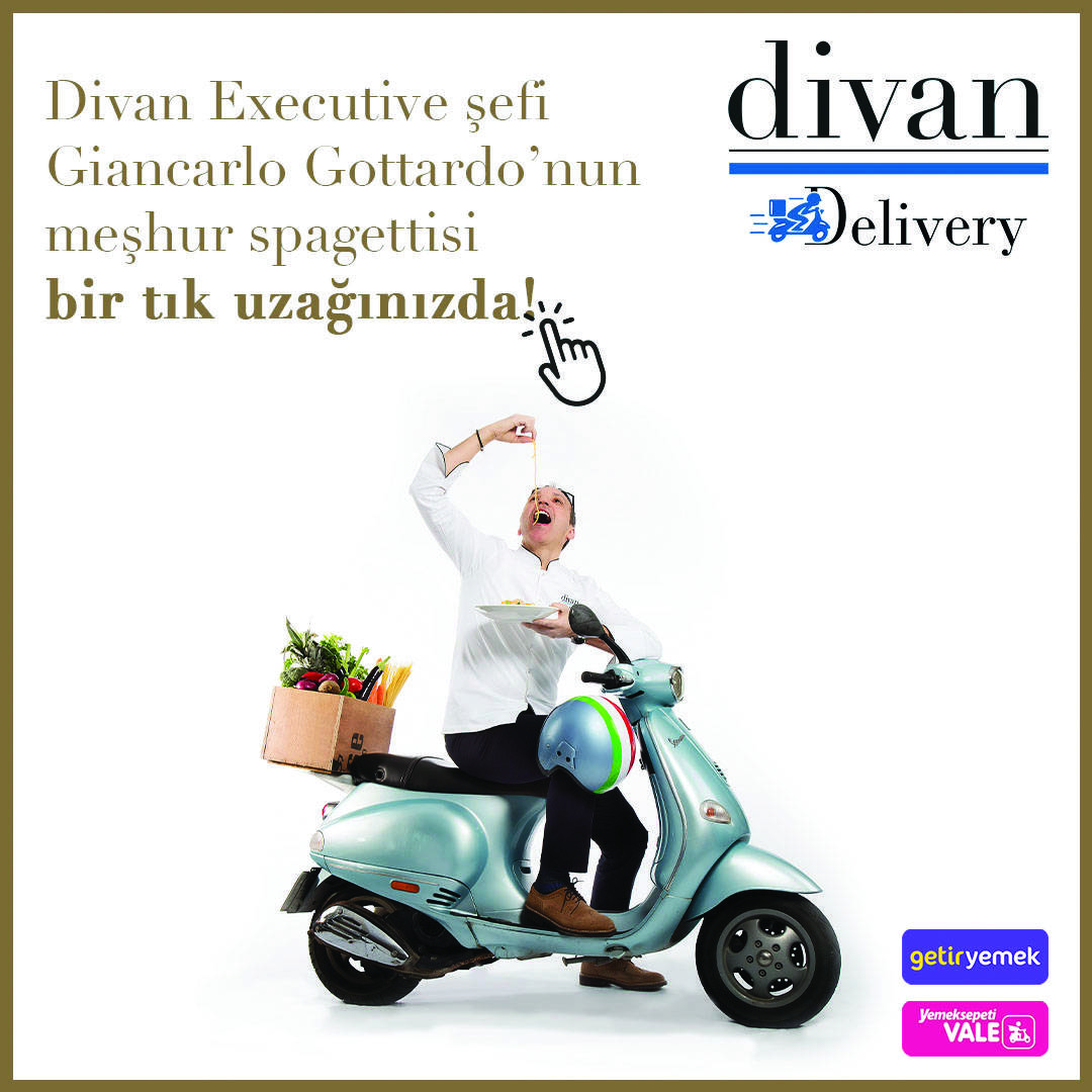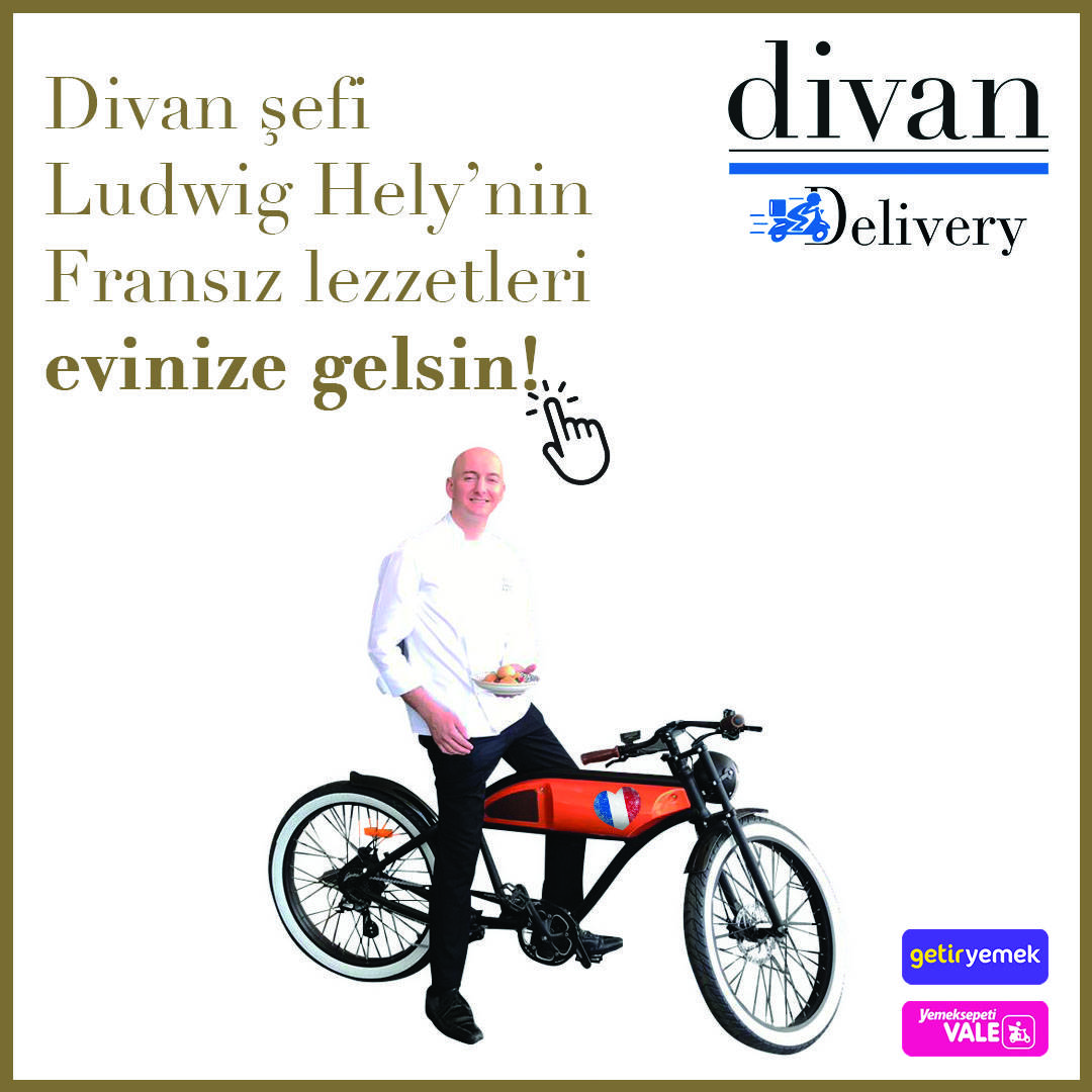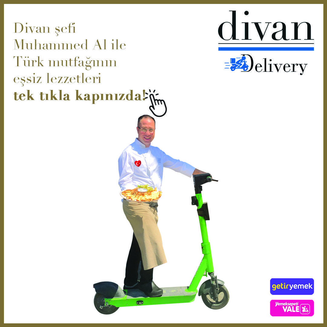 Divan Restoranları’nın usta şefleri tarafından hazırlanarak menüsüne eklediği enfes tatlar, evlerde kurulan neşeli sofralara konuk oluyor. Divan kalitesini evine taşımak isteyenler Yemek Sepeti Vale ve Getir Yemek aracılığıyla Divan Brasserie Bebek, Divan Brasserie Akasya, Divan Brasserie Kalamış, Divan Pub Erenköy, Divan Pub Ataşehir ve Divan İstanbul’dan tek tık ile sipariş verebiliyor. Üstelik Divan Restoranları’nın tercih ettiği akıllı ambalaj sistemi sayesinde hem doğa dostu hem de hijyenik bir sofra kurmak mümkün.