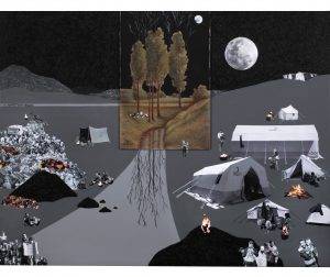 Batıbeki, kolajlarında kullandığı imgelerinde; mültecilerin otantik temsiliyeti ya da marjinalleştirilmesi riskine karşı her zamanki mesafeli tavrını korurken, kendine özgü sanatsal yorumlama pratiğiyle temayı dengeli ve yaratıcı bir aktarımla, farklı bir şekilde ele alıyor. Sanatçının internetten ve basılı yayınlardan elde ettiği, sınırlar ve ulaşılan yeni topraklardaki insanlık hallerine dair görüntüler, düşsel ve aynı zamanda ideal olarak tanımlanan manzaraları merkezine aldığı resimlerin gerçeküstü sahneleriyle kaynaşıyor ve bizi insanlık durumlarına karşı sorularla baş başa bırakıyor.
