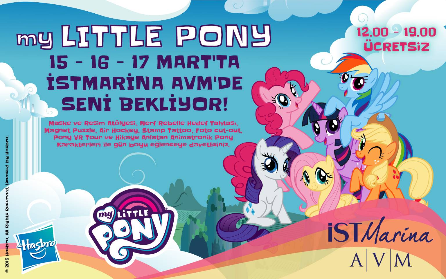 İstMarina AVM, 15 – 16 – 17 Mart 2019 tarihleri arasında çocukların severek takip ettiği My Little Pony’nin efsane kahramanlarına ev sahipliği yapıyor. AVM’nin etkinlik katında kurulacak özel alanda My Little Pony’nin sevilen karakterleri, minik ziyaretçilerini birbirinden özel aktivitelerle gün boyu eğlenceye davet ediyor. Etkinlikte, Maske ve resim atölyesi, Nerf Rebelle hedef tahtası, Magnet Puzzle, Air Hockey, Stamp Tattoo, Foto cut – out, Pony VR Tour gibi etkinliklerin yanı sıra, Pinkie Pie, Twilight Sparkle ve Rainbow Dash’in animatronik maskotları eğlenceli hikayeleriyle miniklere keyifli dakikalar yaşatacaklar.