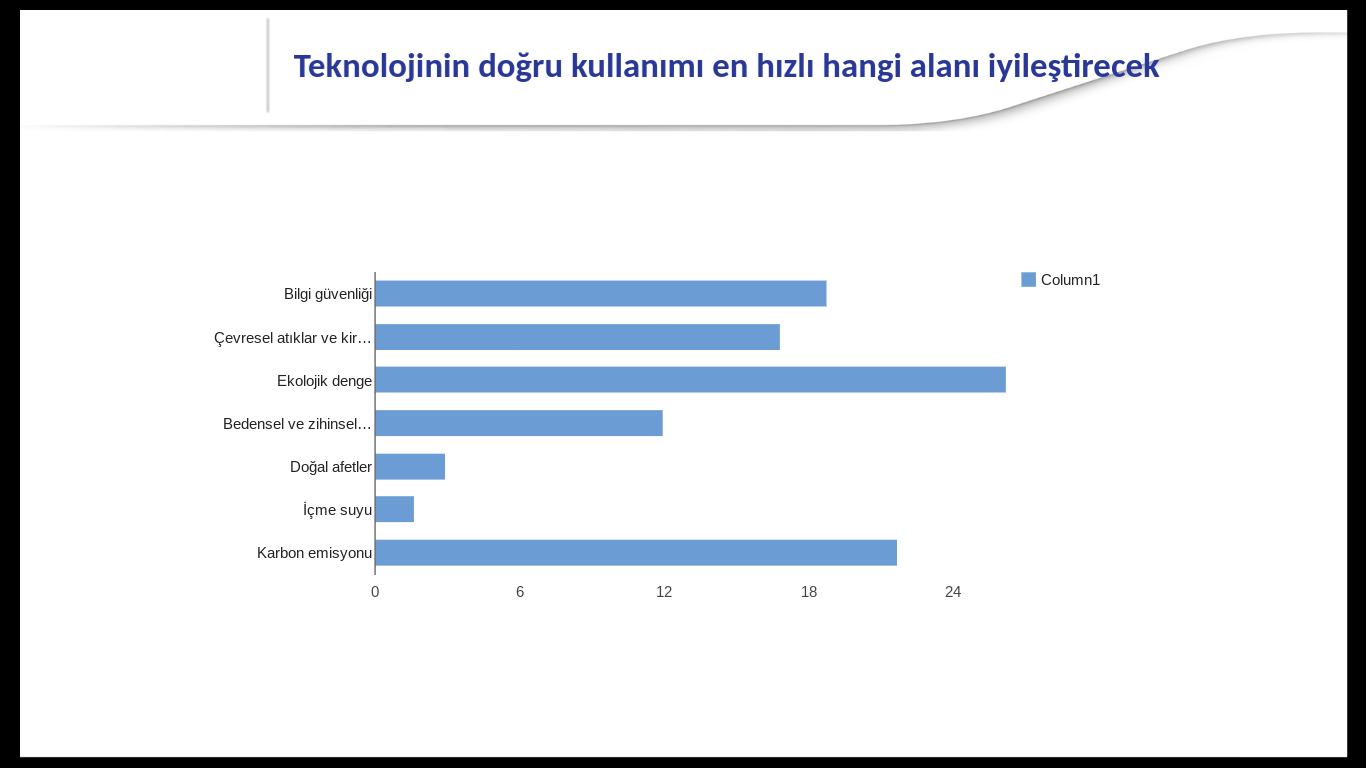 Sürdürülebilirlik çatısında listelenen iyileştirme alanlarına teknolojinin hızlı etkisinin ele alındığı araştırmada; “Teknolojinin doğru kullanımı sizce en hızlı hangi alanı iyileştirecek?” sorusuna en yüksek oranda belirtilen iki yanıt ‘Ekolojik denge ve Karbon emisyonu’ oldu. Yüzde 26,21 oranında belirtilen ‘Ekolojik denge’ ve yüzde 21,68 oranında belirtilen ‘Karbon emisyonu’ yanıtını, ‘Birey güvenliği (%18,77)’, ‘Çevresel atıklar ve kirlilik (%16,83)’ takip etti.