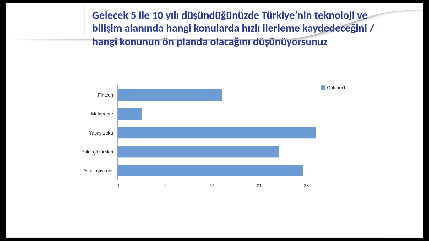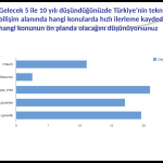 Bilişim teknolojileri alanında gelecek öngörüsünün de sorgulandığı araştırmada katılımcılara “Gelecek 5 ila 10 yılı düşündüğünüzde, Türkiye’nin teknoloji ve bilişim alanında hangi konularda hızlı ilerleme kaydedeceğini / hangi konunun ön planda olacağını düşünüyorsunuz?” sorusu yöneltildi. Katılımcıların yüzde 29,45’u en yüksek oranda ‘Yapay Zeka’ derken, ‘Siber Güvenik’ yüzde 27,51, ‘Bulut Çözümleri’ yüzde 23,95 ile ilk üç sırada yer aldı.