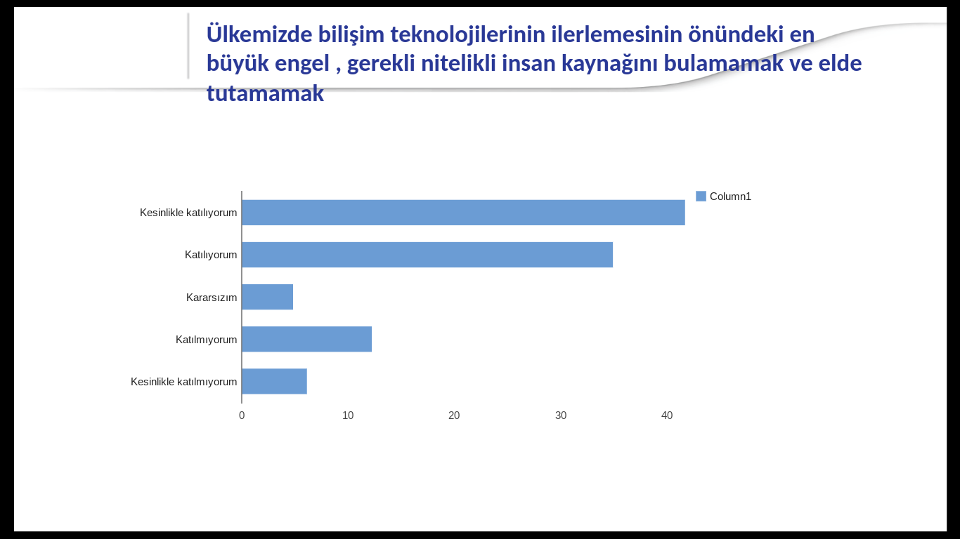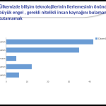 “Ülkemizde bilişim teknolojilerinin ilerlemesinin önündeki en büyük engel, gerekli nitelikli insan kaynağını bulamamak ve elde tutamamak” tanımının katılımcılara yöneltildiği araştırmada, tanıma ‘Kesinlikle katılıyorum’ (%41,75)’ ve ‘Katılıyorum (%34,95)’ diyenlerin toplam oranı yüzde 76,7 oldu. ‘Kararsızım’ yüzde 4,85, ‘Katılmıyorum’ yüzde 12,30 ve ‘Kesinlikle katılmıyorum’ yanıtı yüzde 6,15 oranında alındı.