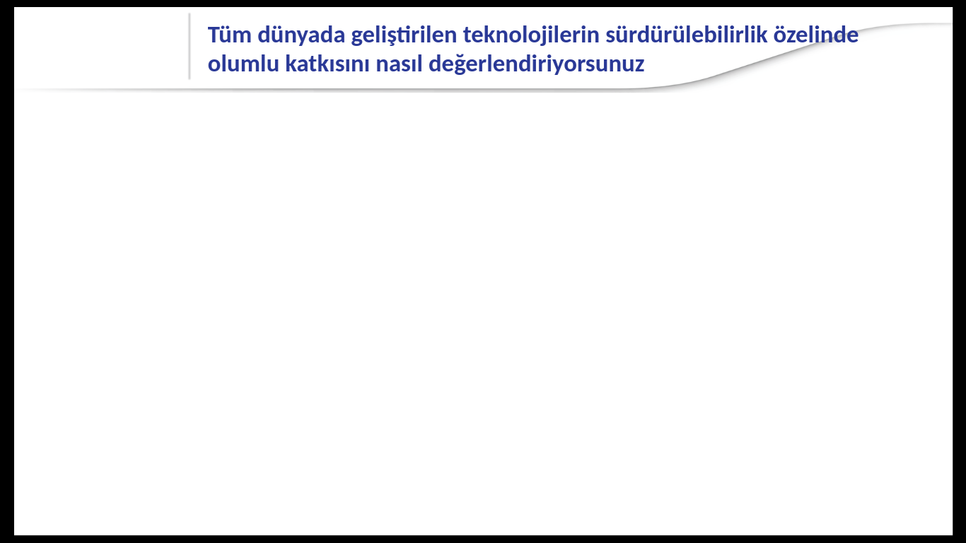 “Günümüzde tüm dünyada geliştirilen teknolojinin ‘sürdürülebilirlik’ özelinde olumlu katkısını” değerlendiren katılımcılar, süreci yüzde 50,49 oranında ‘henüz yolun başındayız’ olarak tanımladı. ‘İlerleme aşamasında’ diyenlerin oranı yüzde 43,04 iken ‘Gelişmeler oldukça iyi durumda’ diyenlerin oranı yüzde 6,47 oldu.